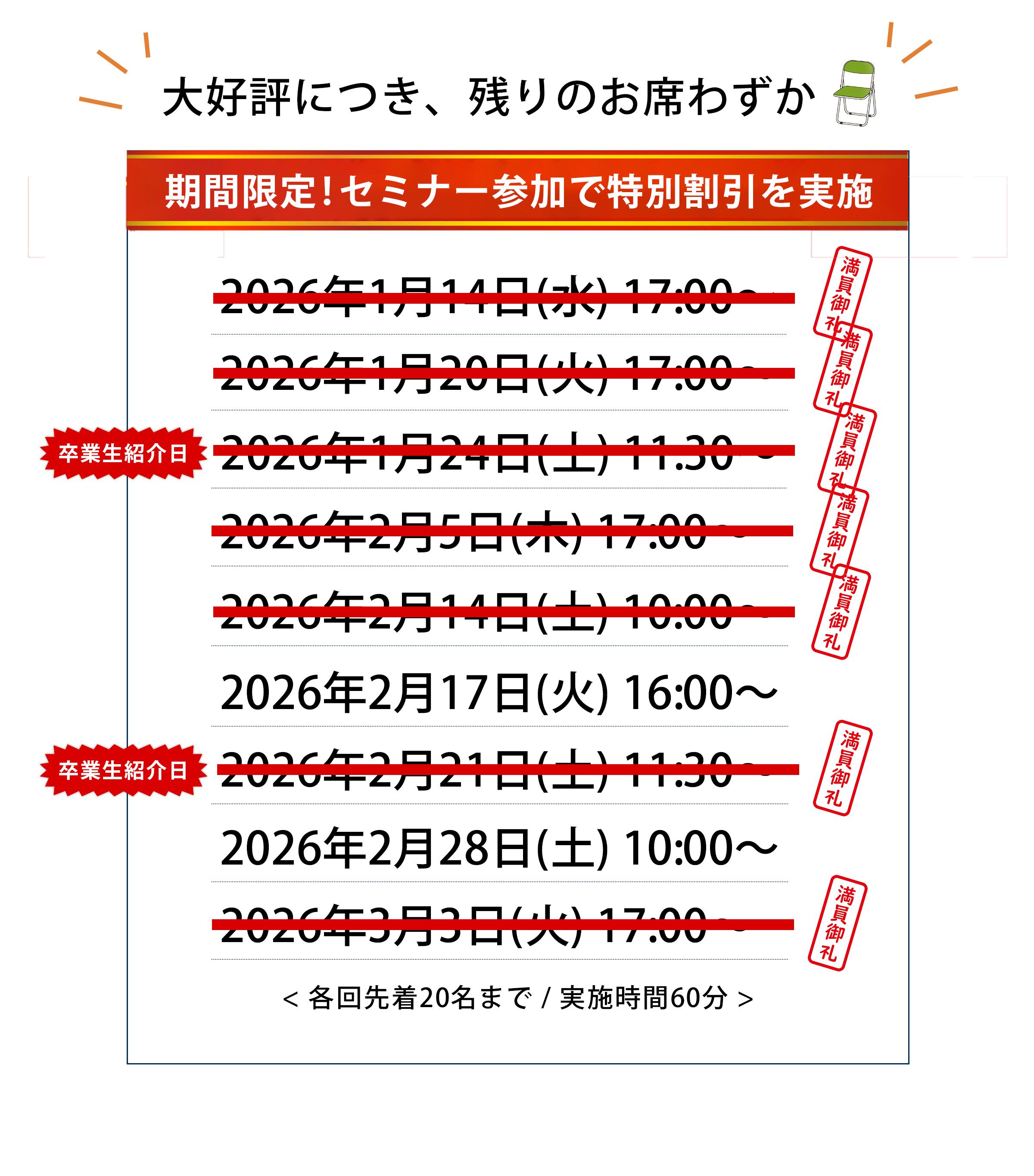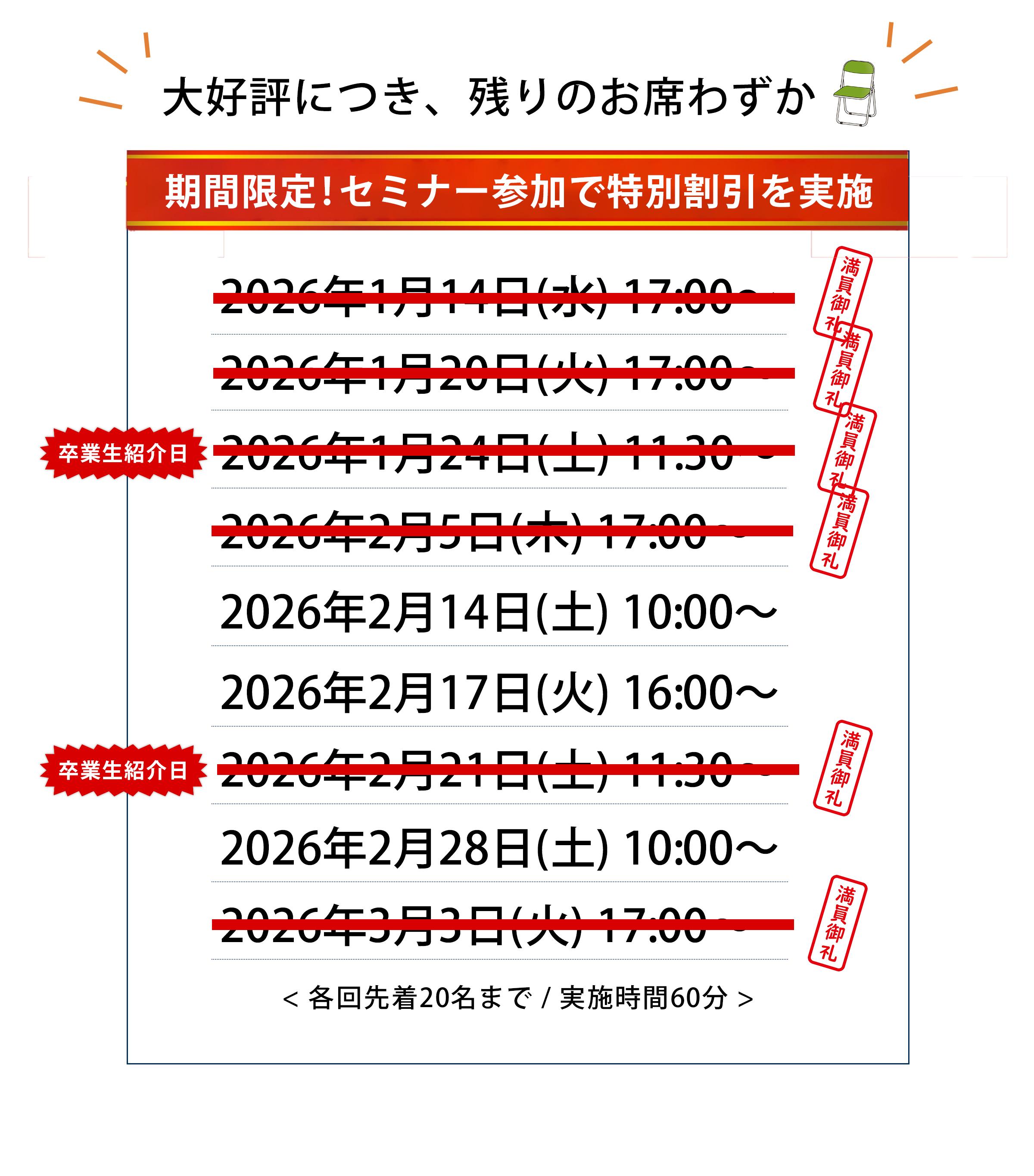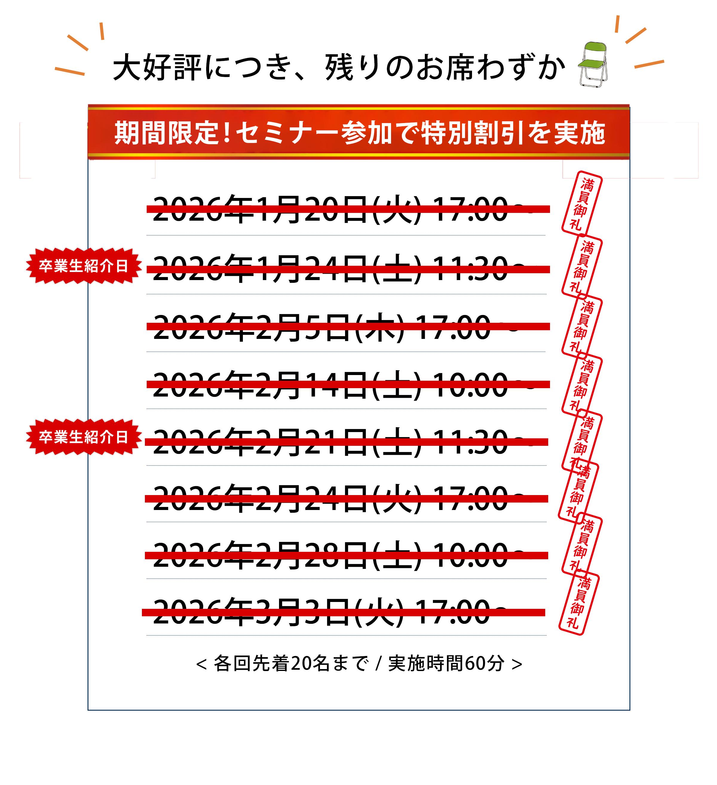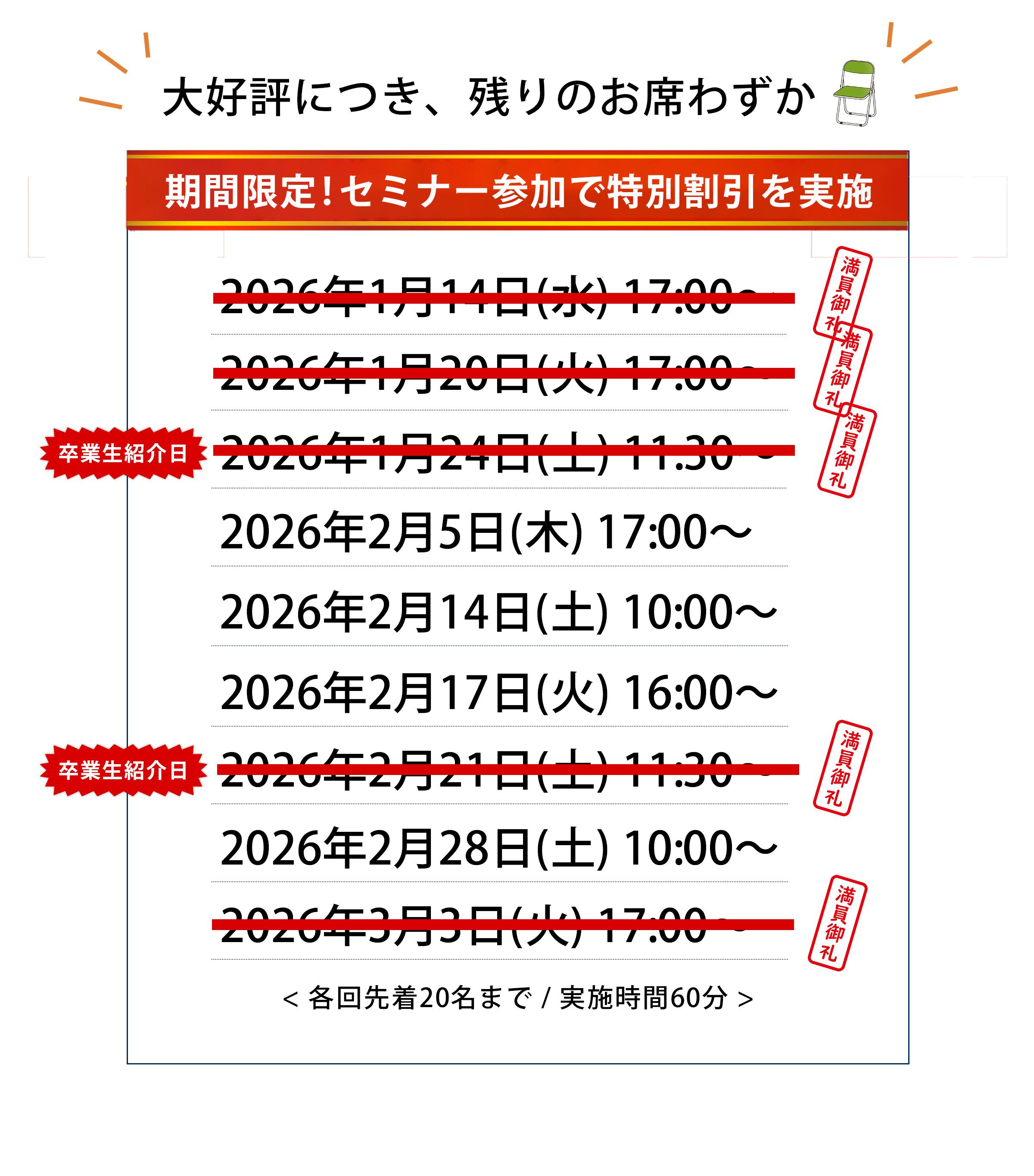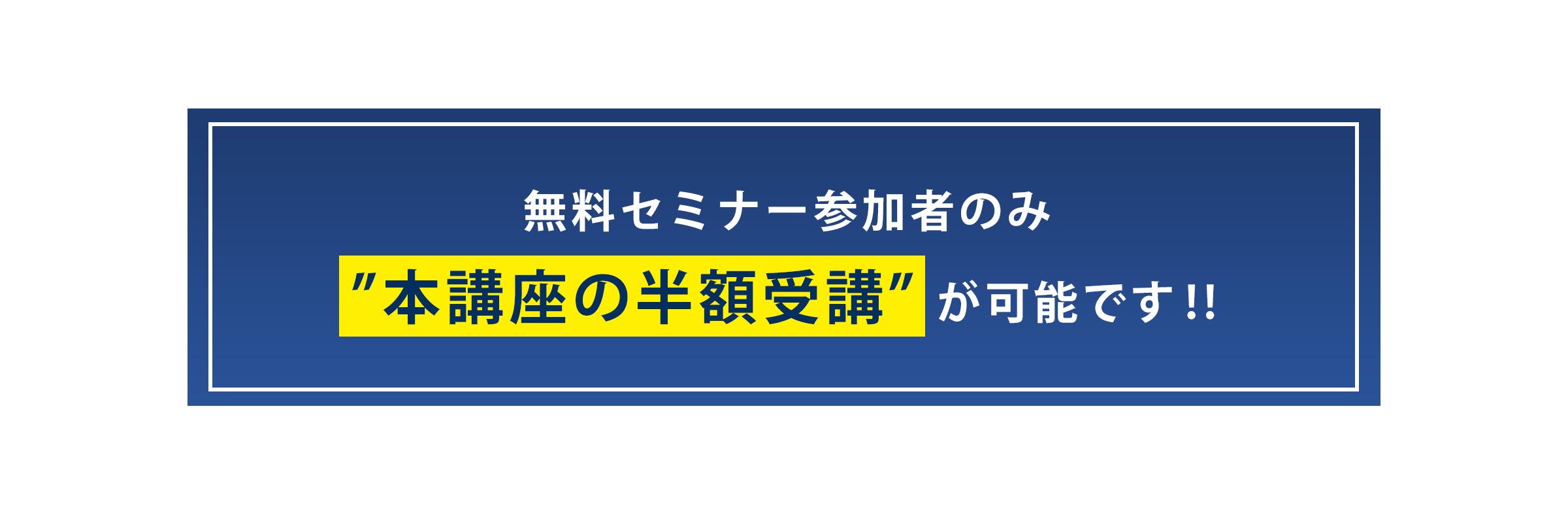 ※無料セミナー参加者のみ本講座の半額受講が可能です。